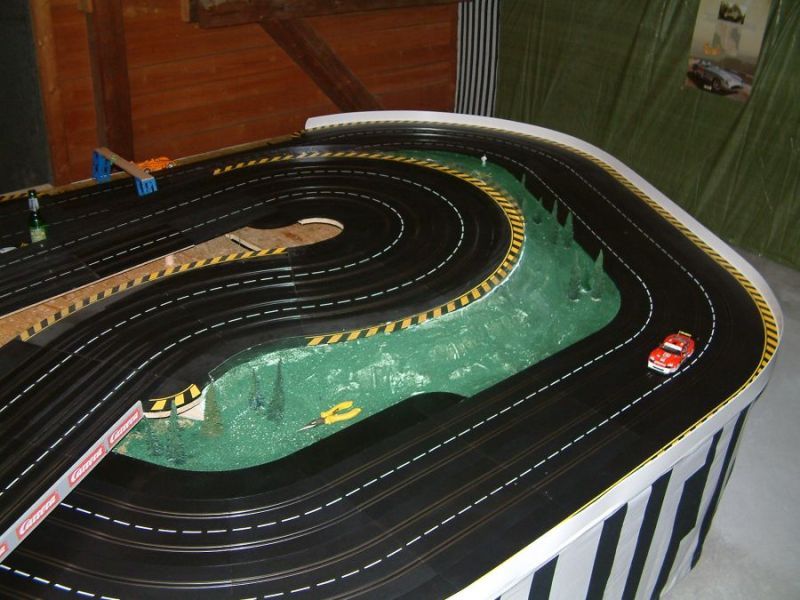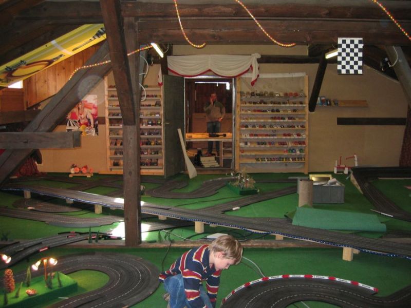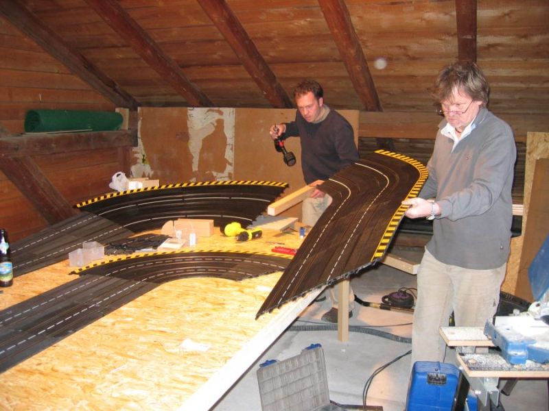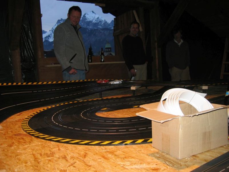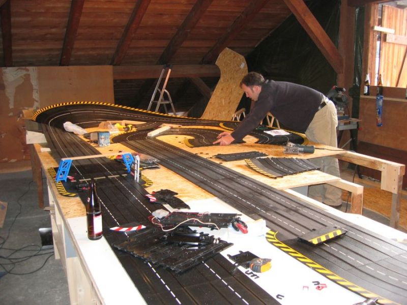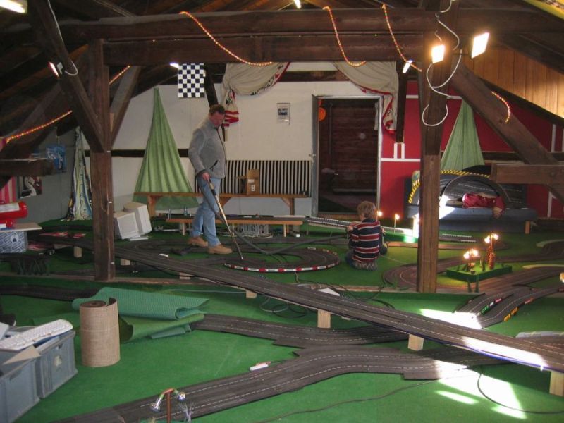 Wie wahrscheinlich alle Slotter hatten wir natürlich auch immer eine Holzbahn im Hinterkopf. Anläßlich des 60igsten Geburtstages von Peter kam dann die große Überraschung, plötzlich war eine 3 spurige Holzbahn, gesponsert von Diethard und den Carrerafreunden, da. Jetzt war die Frage wohin damit? Aber gegen eine Holzbahn konnte die EVO-Bahn natürlich nicht bestehen. Also wurde die EVO-Bahn verkauft und die Holzbahn kam rein.