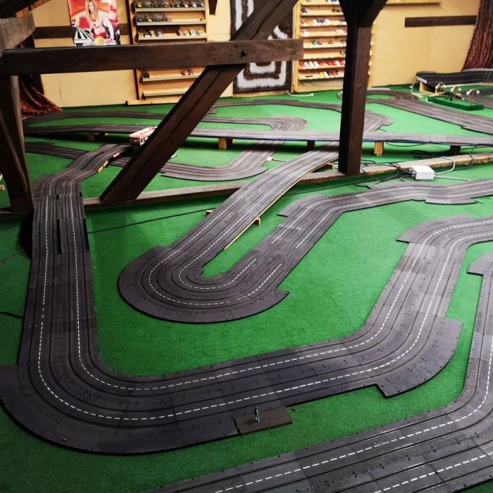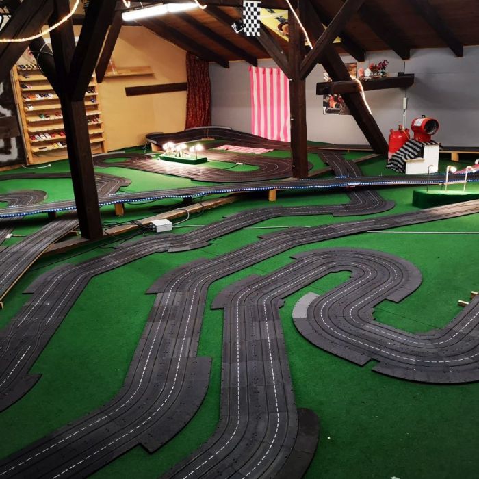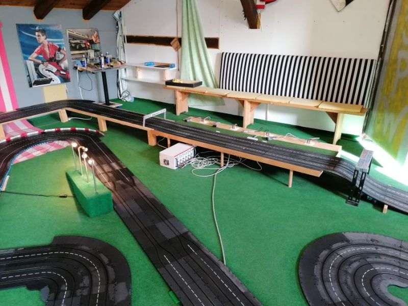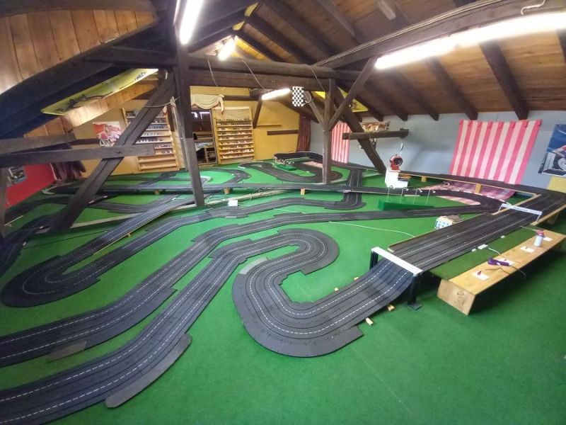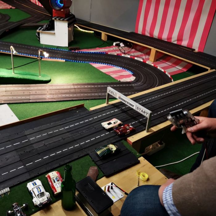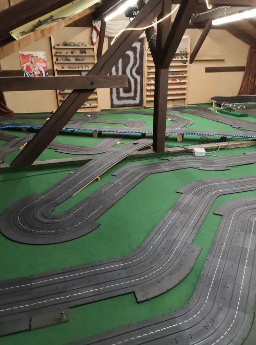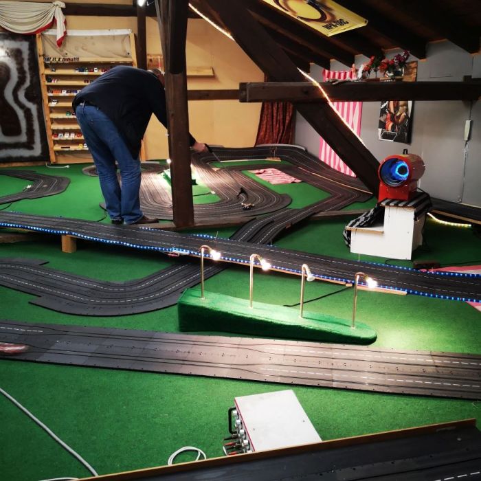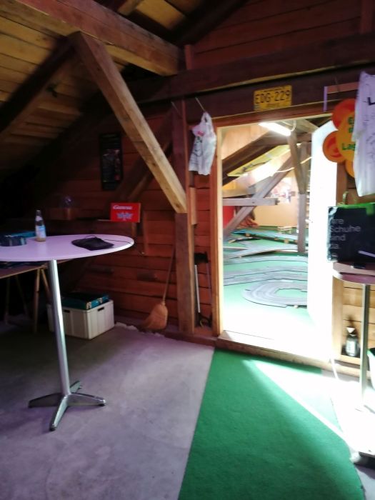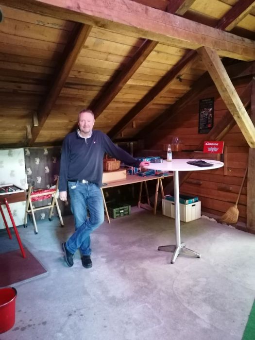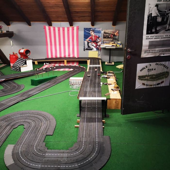 Auszug aus Jimis Keller: Die Suche nach einer neuen Location für die riesige Bahn dauerte eine Weile – doch dann war es so weit. Ein geräumiger Dachboden einer renommierten Spedition in St. Johann erwies sich als perfektes Objekt. Diethard entwarf eine 110 Meter lange Rennstrecke mit allen Schikanen. Die Regler wurden auf hochwertige Parma-Pistolenregler umgerüstet..