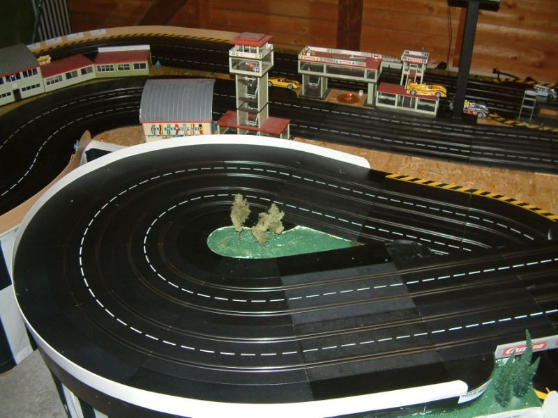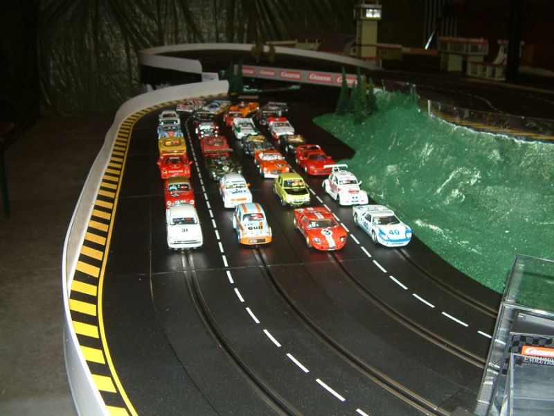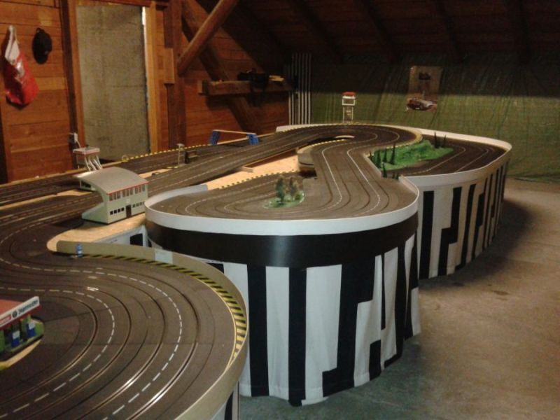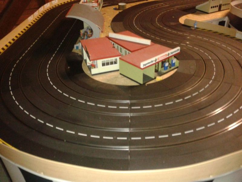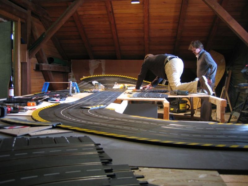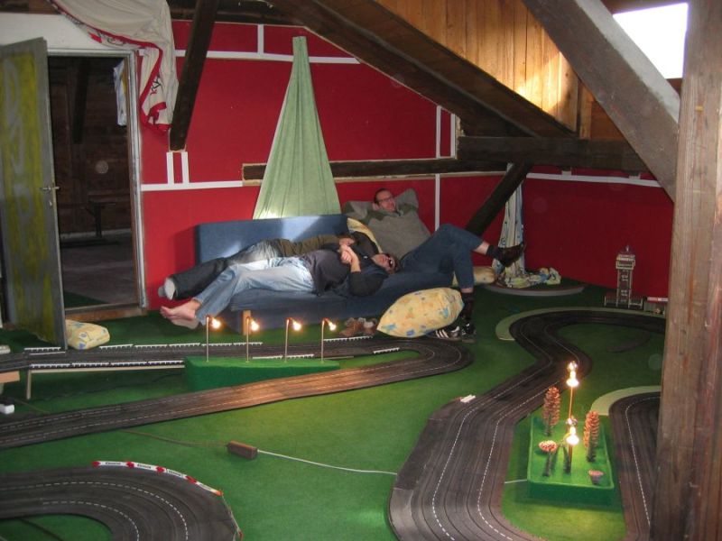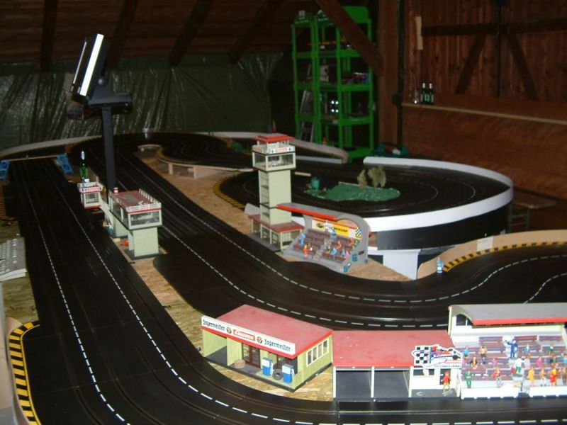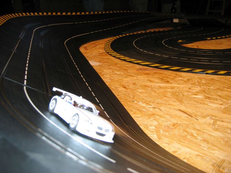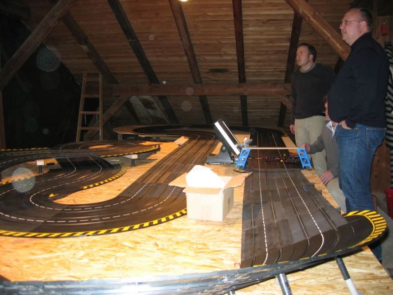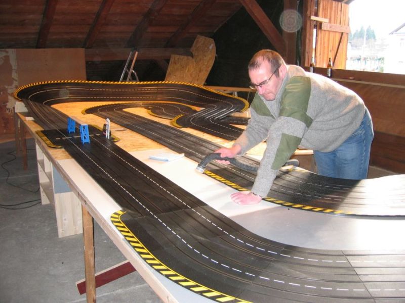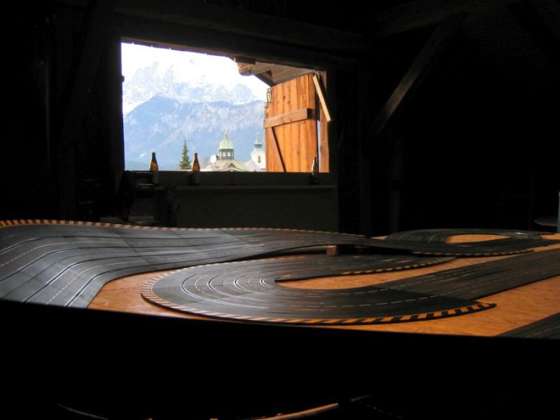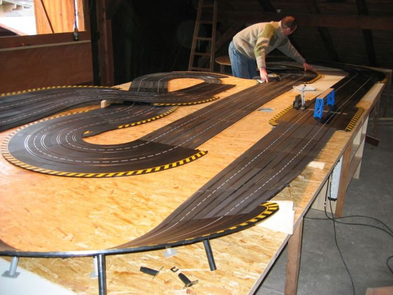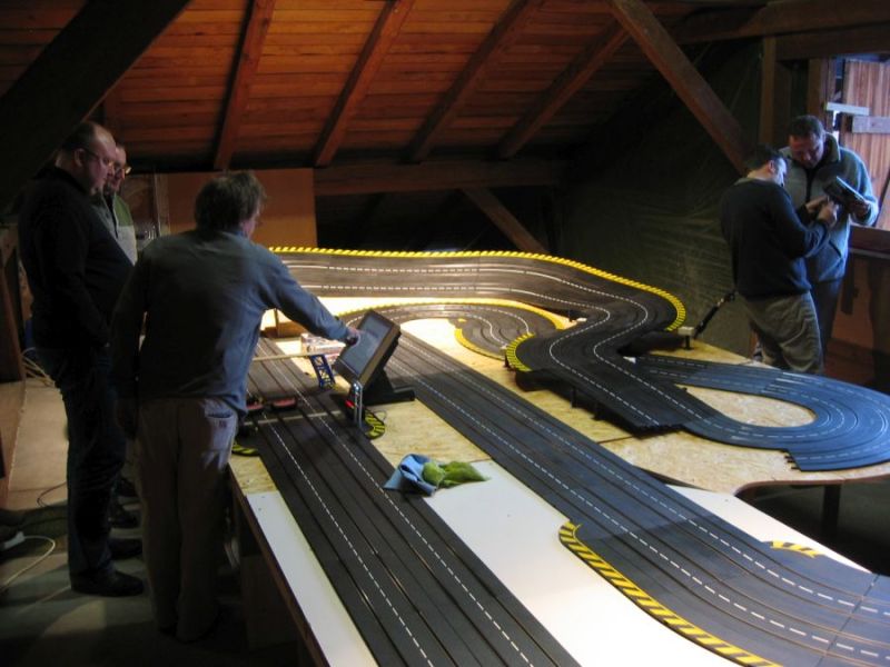 Wie wahrscheinlich alle Slotter hatten wir natürlich auch immer eine Holzbahn im Hinterkopf. Anläßlich des 60igsten Geburtstages von Peter kam dann die große Überraschung, plötzlich war eine 3 spurige Holzbahn, gesponsert von Diethard und den Carrerafreunden, da. Jetzt war die Frage wohin damit? Aber gegen eine Holzbahn konnte die EVO-Bahn natürlich nicht bestehen. Also wurde die EVO-Bahn verkauft und die Holzbahn kam rein.
