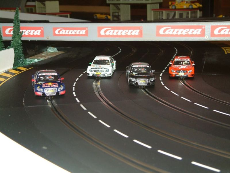 Im Jahr 2008 kauften wir in Linz eine kleine gebrauchte 6-spurige Evolution Clubbahn mit starken Trafos. Aus dieser Bahn bauten wir nach einigen Zukäufen eine 4-spurige Bahn. Mit einer Spurlänge von 25 Metern war sie ideal für flotte Rennen für flotte Männer und sportliche Frauen. Mit einer Aufbauhöhe von 75 cm war sie von allen Seiten gut zugänglich. Als Zweileiterbahn konnte sie mit den Features der Uni Bahn, wie 360° turnarounds, 4 Fahrzeuge auf zwei Spuren, dem historischen Flair der klassischen Carrerabahn natürlich nicht mithalten. Aber dafür haben wir ja unse große UNI Bahn.
